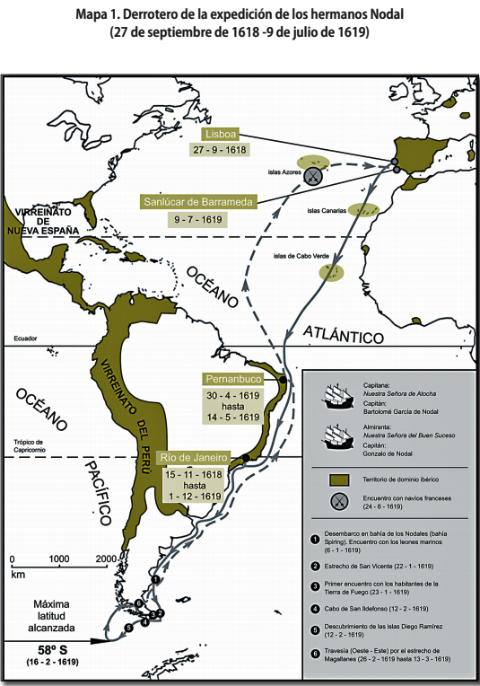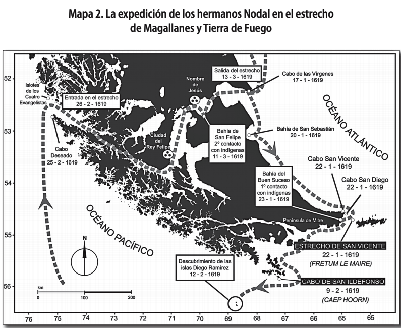 Plano del Reconocimiento de los estrechos de Magallanes y San Vicente, grabado calcográfico entre páginas 34 y 35 de la Relación del viaje que por orden de su Magd y acuerdo del real Consejo de Indias hizieron los capitanes Bartolome Garcia de Nodal y Gonçalo de Nodal… al descubrimiento del Estrecho nuebo de s. Vicente y reconosimieo del de Magallanes…, obra de Bartolomé García de Nodal editada en Madrid por Fernando Correa Montenegro, 1621. Biblioteca Nacional de España.