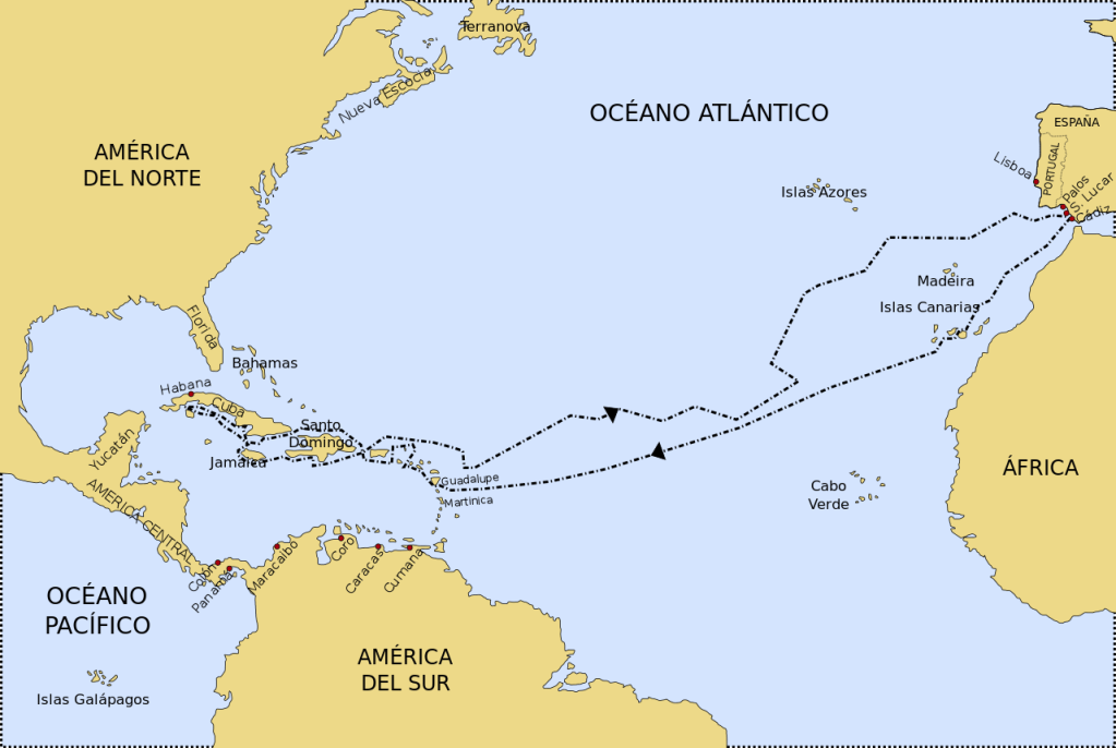 El segundo viaje de Cristóbal Colón partió de Cádiz el 25 de septiembre, descubrió la isla de Guadalupe el 4 de noviembre, que era conocida por los indios carbes como Karukera («isla de las aguas hermosas») y desembarcó en la isla de Puerto Rico el 19 de noviembre. En mayo de 1494 descubrió Jamaica y el 13 de junio la isla La Evangelista (actual isla de la Juventud).