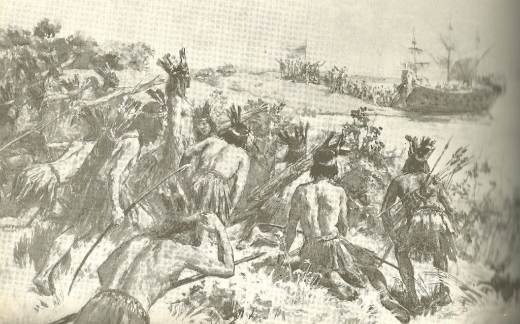 Viendo indígenas en la costa oriental, Díaz de Solís intentó desembarcar en un bote con siete de sus tripulantes, en un paraje entre Carmelo y Punta Gorda, o en alguna isla situada frente a esa costa.