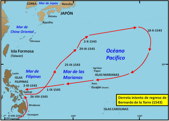 Bernardo de la Torre navegó bajo las instrucciones de Ruy López de VIllalobos , quien lo envió en agosto de 1543 a bordo del San Juan de Letrán para tratar de encontrar una ruta de regreso a la costa occidental mexicana desde Filipinas.