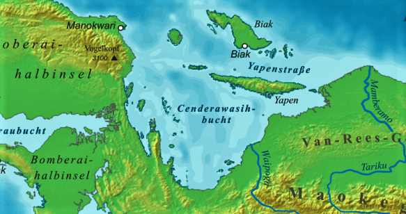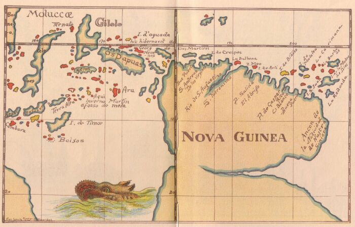 Posteriormente llegó a la costa norte de una gran isla, la actual Nueva Guinea, la cual costeó durante cuatro días, desembarcando el 20 de junio cerca de la desembocadura de un río que llamó San Agustín (río Mamberamo).