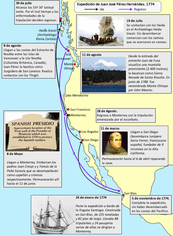Los rumores sobre esos comerciantes de pieles rusos fueron la causa de que los españoles enviasen la fragata Santiago (alias Nueva Galicia) al norte bajo el mando de Pérez, con una tripulación formada mayoritariamente por mexicanos. Curiosamente, a Pérez se le dieron instrucciones explícitas para que tratase a todos los nativos con respeto, y para establecer relaciones amistosas con cualquier nativo encontrado.