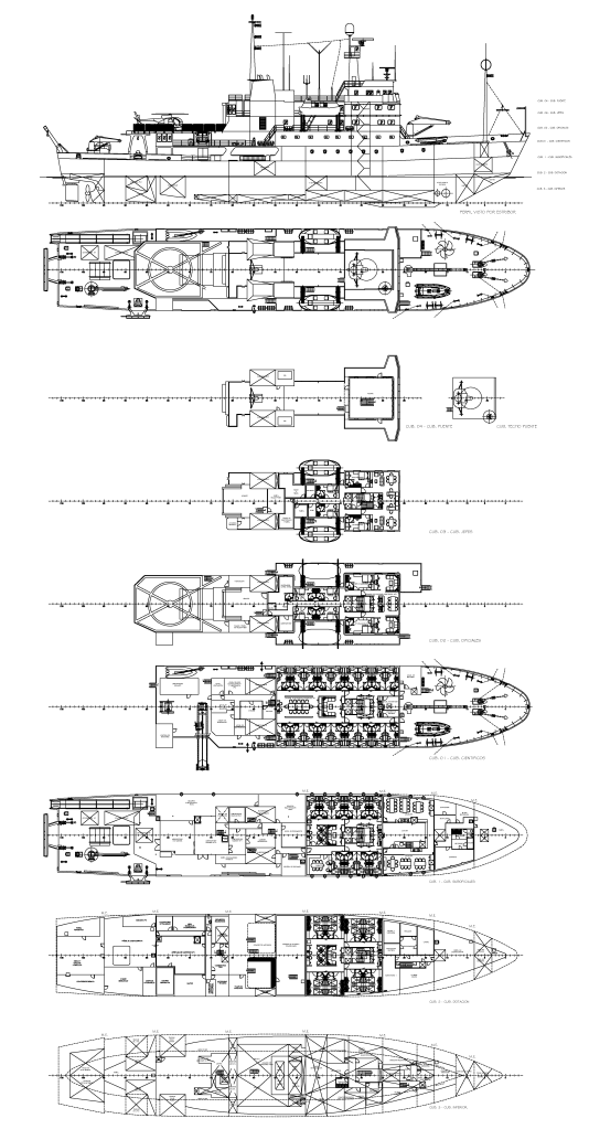 - Sala de Dibujo, Centro de datos, Local Equipos Electrónicos, Taller de Electrónica, Local de Buceo con Cámara Hiperbárica, Local de Sondas y Local de Transductores.