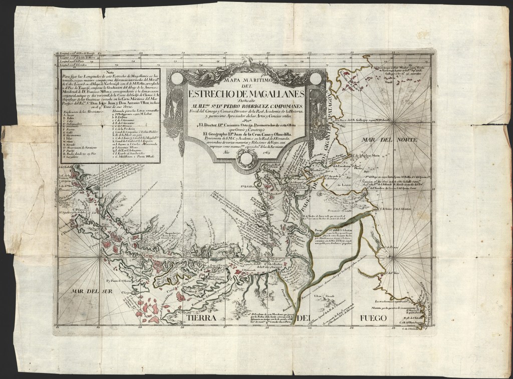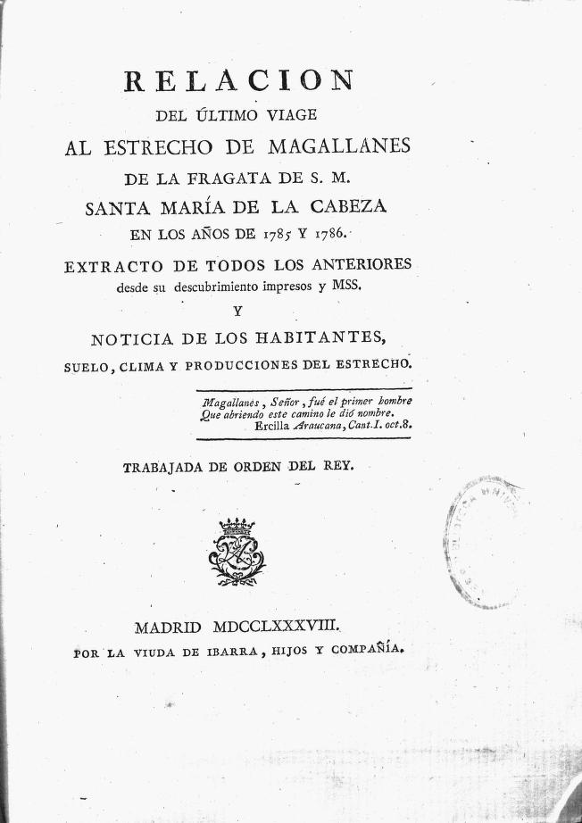 Se publica la Relacion del ultimo viage [sic] al estrecho de Magallanes de la fragata de S. M. Santa Maria de la Cabeza en los años de 1785 y 1786 : extracto de todos los anteriores desde su descubrimiento impresos y mss y noticia de los habitantes, suelo, clima y producciones del Estrecho… by Vargas Ponce, José, 1760-1821; sobre los materiales de Dionisio Alcalá Galiano y Alejandro Belmonte, quienes también son autores de los mapas.