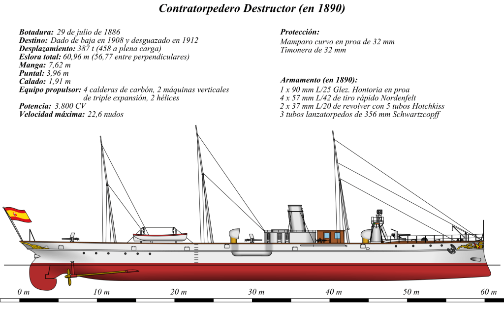 Armamento: 1 cañón Hontoria de 90 mm. 4 cañones de tiro rápido Nordenfelt de 57 mm. 2 cañones revólver Hotchkiss de 37 mm. y 2 tubos lanzatorpedos de 365 mm con 3 torpedos Schwartzkopff por tubo.