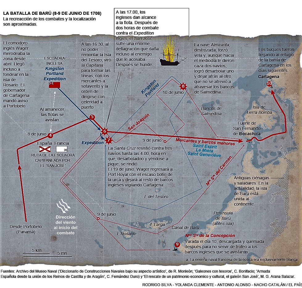 Wager cree que el tesoro está repartido en los 3 navíos más grandes, así que el HMS Expedition toma rumbo directo al galeón San José para abordarlo abriéndose paso a cañonazos.