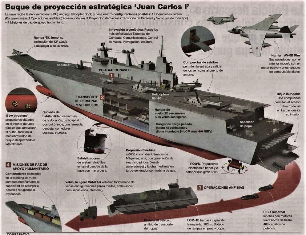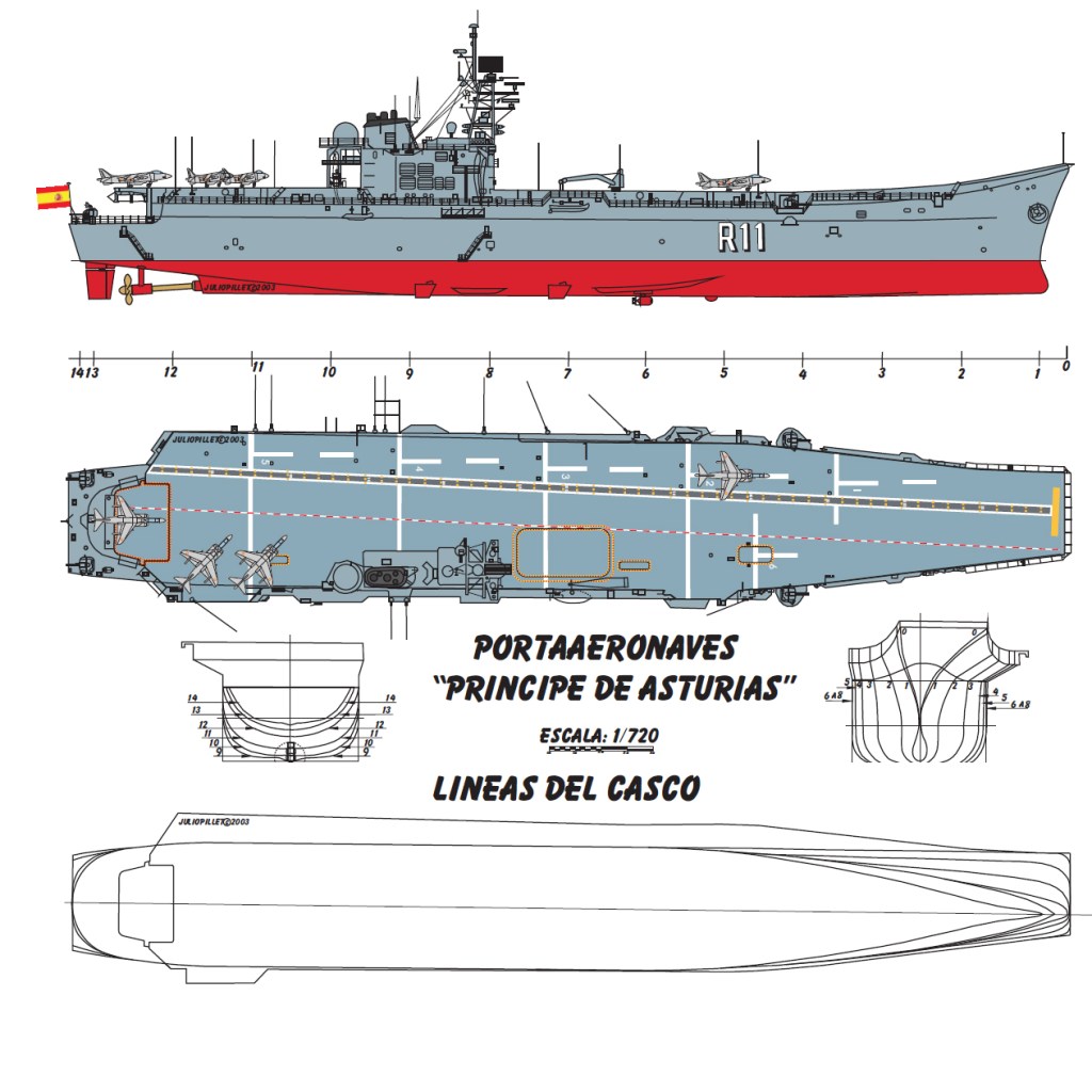 Dimensiones: 195,9 m de eslora, 24,3 m de manga y 9,4 m de calado. Desplazamiento 17.188 tapc. Armamento: 4 FABA Meroka mod 2A3 CIWS 20 mm/120 y 2 Rheinmetall 37 mm (salvas). Propulsión: COGAG – 2 turbinas de gas Bazán-General Electric LM2500+ y 1 hélice de 5 palas y paso variable de ø6,096 m. 46.000 CV de potencia. Velocidad 26 nudos. 555 tripulantes y 208 del grupo aéreo.