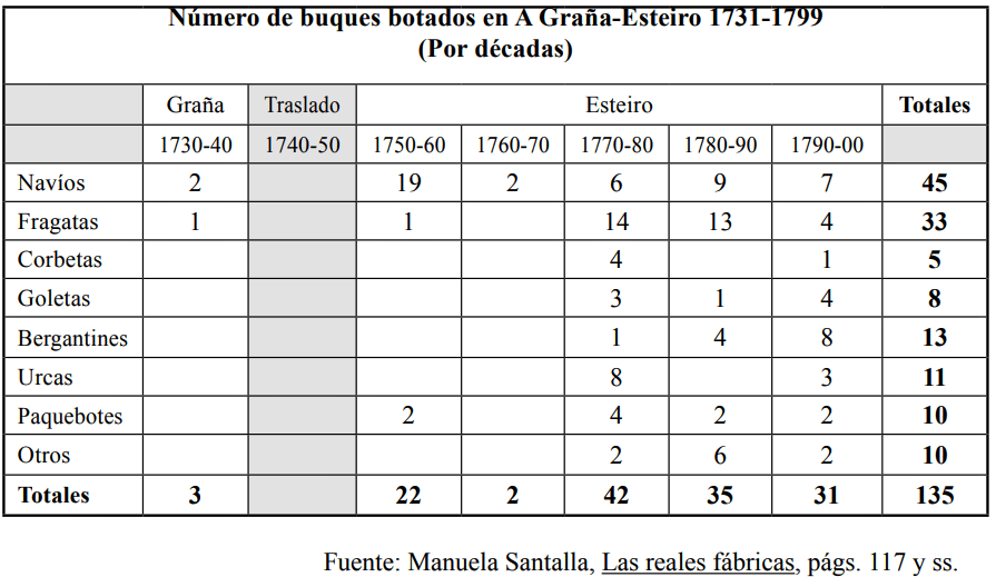 Ya hemos relatado que entre 1729 y 1730 se construyeron los primeros buques, Galicia y León, de 70 cañones. Se construyó también una fragata, Hermione, de 36 cañones, y una grúa flotante. Sin embargo, en 1747, el rey Fernando VI decidió paralizar las obras en La Graña, iniciándose la construcción de un nuevo astillero en las riberas de Esteiro (Ferrol). Hasta 1756 estuvo ubicada en este pequeño poblado la Escuela de Pilotos, fecha en que se traslado a Ferrol.