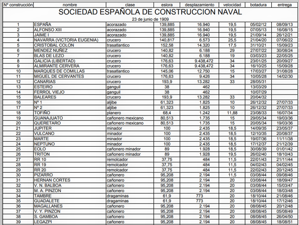En 1909 se establece la Sociedad Española de Construcción Naval que realiza las siguientes construcciones para la Armada Española: