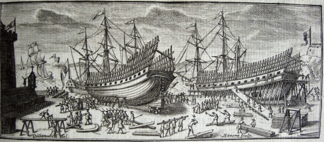 La primera construcción de buques se efectuó en el astillero de La Graña y entre 1730 y 1735 se construyeron 3 navíos, una fragata y 2 buques machina, uno para arbolar y otro para tumbar la quilla y carenar.