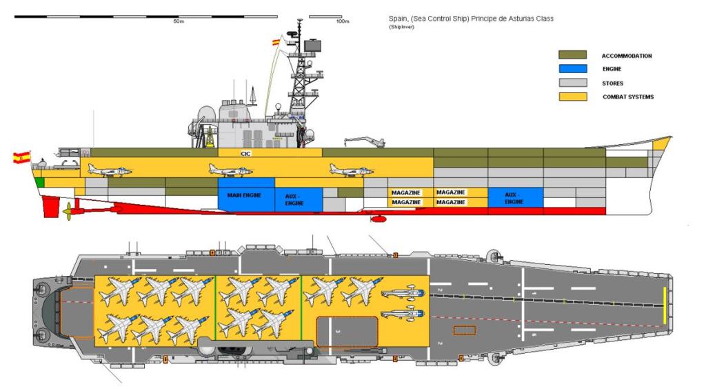 Equipamiento de aeronaves: cubierta de vuelo corrida 175,3 × 29 m. Hangar bajo cubierta de 109 × 22 m. 2 ascensores y Rampa skyjump 12º.