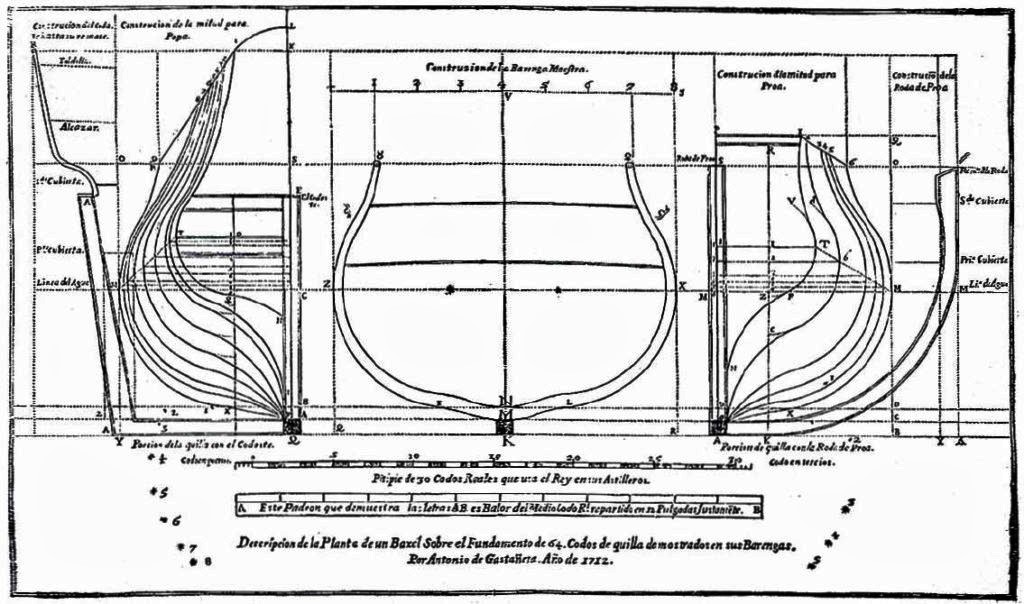 (1) Antonio de Gaztañeta publicó las obras: 1688. Arte de fabricar reales. 1712. Proporción de las medidas arregladas a la construcción de un bajel de guerra de setenta codos de quilla. 1720. Proporciones más esenciales para la fábrica de navíos y fragatas. a partir de las normas sobre dimensiones y diseño de navíos de 60 cañones, que resultaron de buenas condiciones marineras, construidos en los astilleros de Guarnizo y Pasajes los años 1716 y 1717.