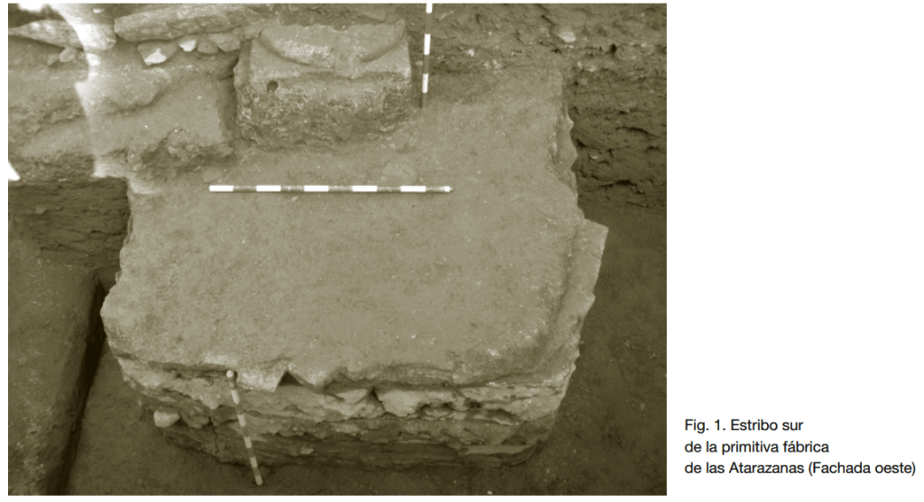 En el primer cuarto del siglo XIII ibn Askar-ibn Jamis escribía: “Yo encontré en los escritos de ilustre alfaquí Abu l-Tahir al Sabti lo siguiente: Me recibió el visir y Katib Abu Abd Allah Nizar, en las atarazanas de Málaga”. El astillero presentaba planta rectangular, dividida en cinco naves longitudinales, con orientación norte-sur y que se abrirían hacia la orilla meridional a través de sendas puertas. Dichas naves se hallaban cruzadas por otras diez transversales, en sentido este-oeste. Su perímetro estaría circundado por una serie de pequeñas torres o estribos de planta rectangular o cuadrada,