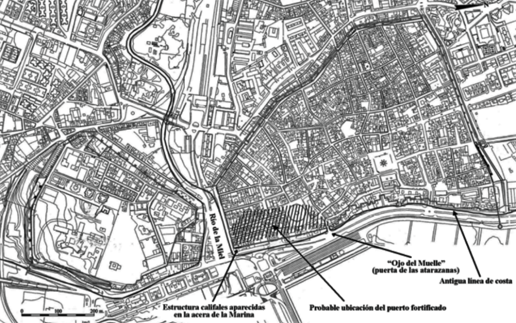 1379. El canal de acceso al arsenal cegado en opinión de Ortiz de Zúñiga. Si damos por cierta la existencia en los primeros siglos andalusíes de un estuario o zona inundable que ocupaba una parte del curso bajo del río de la Miel, las atarazanas que edificara o más probablemente el puerto interior fortificado, se hallaría situado entre la calle conocida como Ojo del Muelle y el extremo meridional de la actual Plaza del Mercado, siendo el vano que dio nombre a la vía.