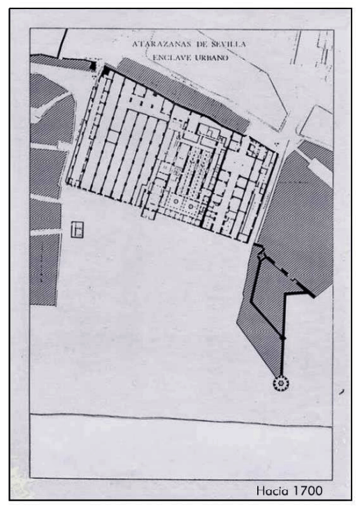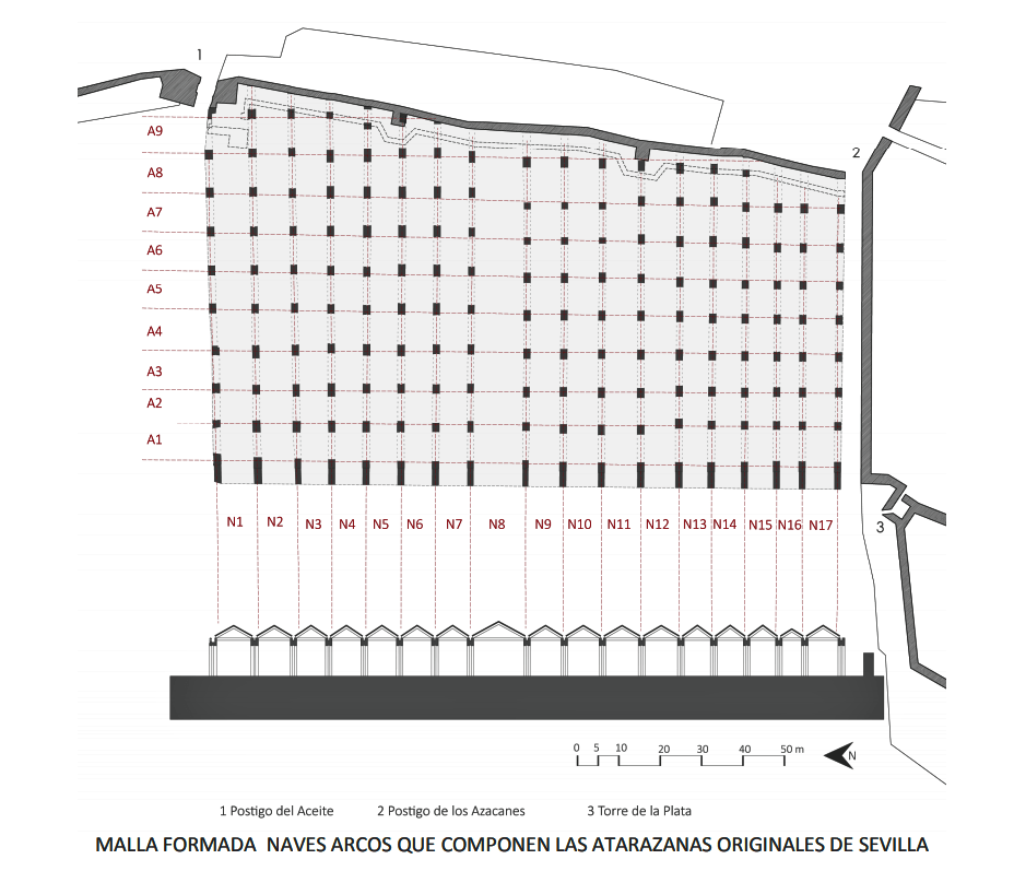 Por ello, en el barrio de El Arenal se levantaron 17 naves levantadas sobre gruesos pilares de ladrillo, anchas y altas, para construir y varar en ellas embarcaciones de alto bordo. En los ángulos del edificio había almacenes cubiertos para conservar las velas y jarcias, pertrechos, armaduras, armas y todo lo necesario para armar una flota de guerra. Encima se habilitaban habitaciones para alojar al alcaide y otros empleados. de fábrica de ladrillo en sentido perpendicular al Guadalquivir y delante de la cerca almohade de la ciudad, que cubrían unos 15.000 metros cuadrados.