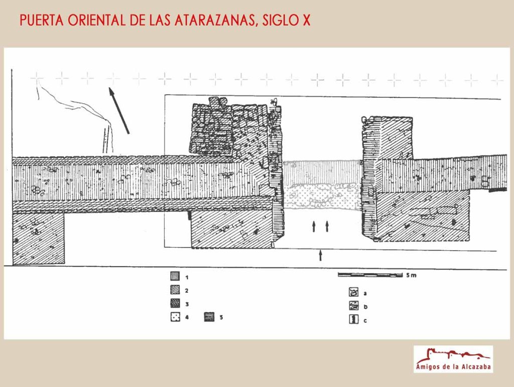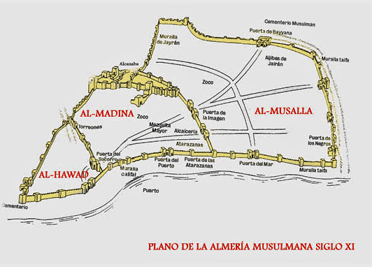 955. debido a la importancia de este enclave, sufre un ataque por parte de una escuadra fatimí, que destroza las atarazanas y gran parte de las infraestructuras navales con las que contaba. Este hecho lleva al califa Abd al-Rahman III a tomar la decisión de dotarla de murallas, de las que carecía hasta el momento, al tiempo que le otorga la categoría de medina, es decir, de ciudad. De este momento data la muralla que se conserva en el enclave, que se siguió utilizando durante todo el periodo medieval y construye atarazanas, divididas en dos naves, la una para construir barcos de armada y guardar sus pertrechos y armamento, y la otra para lonja a modo de bazar donde tenían los mercaderes sus tiendas. Más tarde se construyeron carracas en ellas.