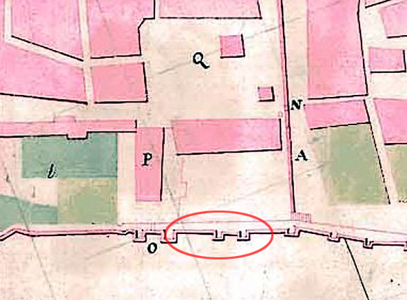 En el tramo conservado de muralla existen los restos de una puerta que se abría entre dos torres cuadrangulares que protegían la entrada. Esta Puerta, que sólo se conserva a nivel de cimientos, medía 6 m y, dada la cercanía al lugar en el que se construían los barcos, algunos autores han interpretado que podría tratarse de la puerta de las atarazanas.