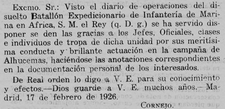 Poco más tarde, por Real Orden el propio Alfonso XIII les dio expresamente las gracias a todos los miembros de este Batallón Expedicionario de Infantería de Marina por «su meritísima conducta y brillante actuación en la Campaña de Alhucemas».