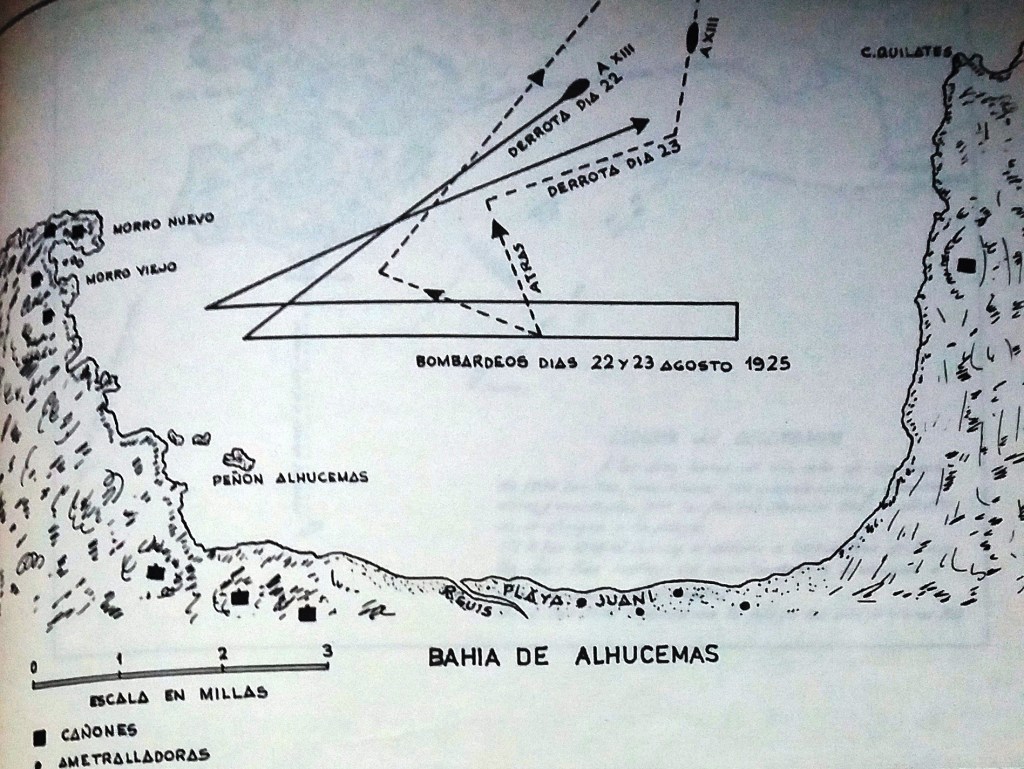 Entre las primeras acciones se bombardeó posiciones enemigas de la bahía de Alhucemas, los días 22 y 23 de agosto, por el acorazado Alfonso XIII.