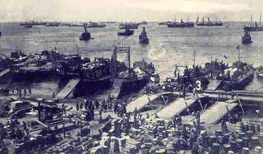 El día de desembarco era el 7 de septiembre pero la dispersión sufrida por los buques de transporte, debida al mal tiempo, hizo que se suspendiese, quedando fijada para la madrugada del día 8; pero el mal tiempo volvió a dispersar a los transportes y tardaron en enviar la primera oleada de barcazas K, remolcadas por guardacostas y remolcadores hasta 1.500 metros de la orilla y luego por sus propios medios y apoyados por el fuego de los buques de guerra, tocaban fondo en la playa, a 50 metros de la orilla, a las 11:50.