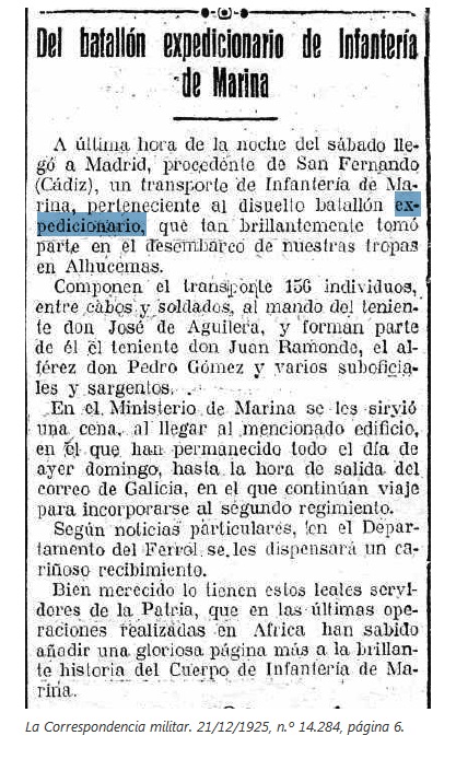 El 15 de diciembre de 1925, el Batallón Expedicionario de Infantería de Marina llegaba al Arsenal de La Carraca a bordo del España nº 5. Los últimos dos meses desde que se dio por concluida la operación, los Infantes de Marina estuvieron construyendo y guarneciendo una decena de fortificaciones en el sector de Axdir.