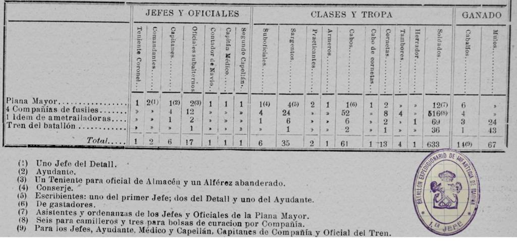 El 1º Batallón Expedicionario de Infantería de Marina se organizó en noviembre de 1.924 en San Fernando (Cádiz), formado por cuatro compañías de fusiles, una de ametralladoras y el tren de batallón, totalizando 782 hombres, 14 caballos y 67 mulos, al mando del teniente coronel José Aubarede Kierulf.