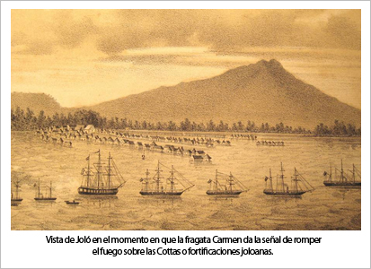 En vista de que la piratería joloana no cesaba, se ordenó, en el mes de febrero, al capitán general del Archipiélago contralmirante don José Malcampo y Monge, ponerse al mando de una escuadra compuesta por una fragata, tres corbetas, dos goletas, doce cañoneros, dos transportes y catorce buques mercantes de transporte, llegando a las islas de Bacungán y Joló.