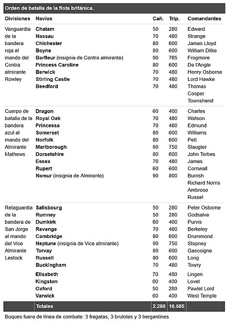 Matthews había dividido su flota en 3 divisiones: una vanguardia de 9 navíos al mando del contraalmirante William Rowley, un centro de 10 navíos bajo su mando directo y una retaguardia de 13 navíos al mando del vicealmirante Richard Lestock.