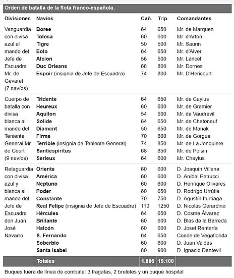 La flota francesa mandada por Claude-Élisée de Court de La Bruyèret zarpó de Tolón el 19 de febrero, navegando hacia el sur en una línea de batalla que se extendía a lo largo de seis millas, con 9 navíos franceses en la vanguardia, 6 franceses y 3 españoles en el centro, y 9 españoles en la retaguardia; izó su insignia en el Terrible, de 74 cañones, mientras que Navarro hizo lo propio en el Real Felipe, de 114 cañones.