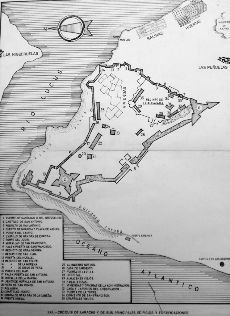Zarparon por la tarde, y en la mañana del 4 de junio fondearon a 6 cables (algo más de un km) de la barra de Larache, formada por la desembocadura del Lucus sobre la que se asienta la población.