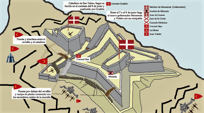 La decisión de conquistar San Elmo bajo cualquier circunstancia fue a la postre una de las principales razones del fracaso turco. Un largo asedio lejos de las bases principales y con tantas bocas que mantener se vislumbró insostenible a cada semana que pasaba. Finalmente, el día 23 de junio, tras un mes de asedio y 6.000 muertos en las filas turcas se hicieron con su anhelado objetivo: ¡un amasijo de ruinas! Por el camino quedó el legendario Dragut, que, empeñado en impedir la llegada de refuerzos, fue alcanzado en su galera por un proyectil desde San Ángel.