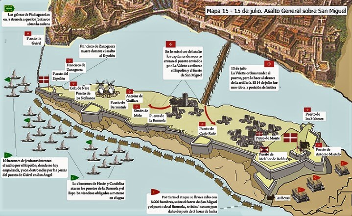 La llegada de Cardona fue la única noticia positiva en esos días. Con los suministros malteses en caída libre, Mustafá ordenó el primer ataque contra la ciudad principal el día 15 de julio.