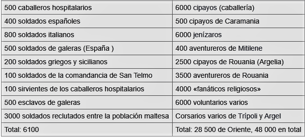 Frente a estas exiguas fuerzas, las huestes otomanas habían reunido una de las mayores flotas de invasión de la historia moderna: 131 galeras y medio centenar de barcos de menor calado, cargados con un completo tren de asedio con 64 cañones, entre ellos 4 que disparaban proyectiles de 130 libras y un pedrero de asedio que disparaba proyectiles de 7 pies de circunferencia. En lo referido a las fuerzas terrestres el número oscila, según la fuente, de 25.000 a 40.000 soldados, entre ellos se incluían 6.000 cipayos de caballería 4.000 fanáticos religiosos y 6.000 jenízaros (la infantería de élite otomana).