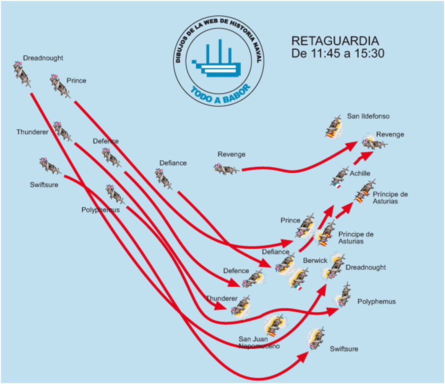 8- El Berwick y el San Juan Nepomuceno, de Churruca, quedan atrás luchando contra varios navíos británicos. El fresco Dreadnougt ha terminado de rematar a los maltrechos navíos.