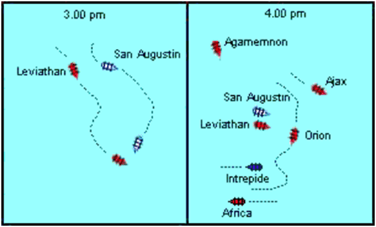 Había dejado anteriormente al Neptune (britanico) tratando con el Trinidad, y se dirigió al Neptune (francés), quien escapó. Sin ninguna captura todavía, se acercó a la vanguardia y se encontró con el San Agustín que venía de trabar combate sobre las 15:00. Cuando dentro de los 100 metros, el español viró a estribor para atacar. El Leviathan viró a su vez y atacó por su lado de estribor. Temeroso de que el español, con buena maniobrabilidad tras estos primeros disparos, el Leviathan corrió a su lado y atacó sin descanso junto con los navíos Orion y Ajax, que a su paso descargaron sus cañones, hasta que una hora después el navío español se rindió. El San Agustín había logrado evitar dos abordajes británicos, no se rindió, sino que los británicos lo tomaron al ver que no hacía ya fuego dada la gran destrucción a bordo. Tras haber asegurado su captura el buque británico recibió los disparos del Intrepide francés que volvía con varios navíos desde la vanguardia.