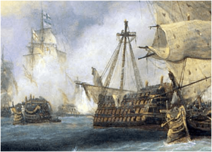 3- La casi legendaria resistencia del Santísima Trinidad se ve forzada irremediablemente a la rendición tras un hostigamiento inhumano. La aparición del Prince de 100 cañones e intacto será el que le de la puntilla al navío español.