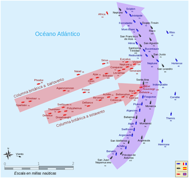 Con esta disposición de ataque en forma de dos columnas paralelas en perpendicular a la línea formada por Villeneuve, Collingwood cortaría la línea a la altura del Santa Ana y Nelson a la del Santísima Trinidad.