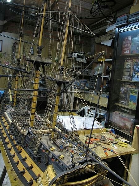 Buque insignia del vicealmirante Horatio Nelson. El Victory rompió la línea entre el Bucentaure y el Redoutable disparando una andanada de triples en la popa del primero desde una distancia de unos pocos metros. A la una y cuarto, Nelson recibió un disparo, la bala fatal del mosquete entró en su hombro izquierdo y se alojó en su espina dorsal. Murió a las cuatro y media.