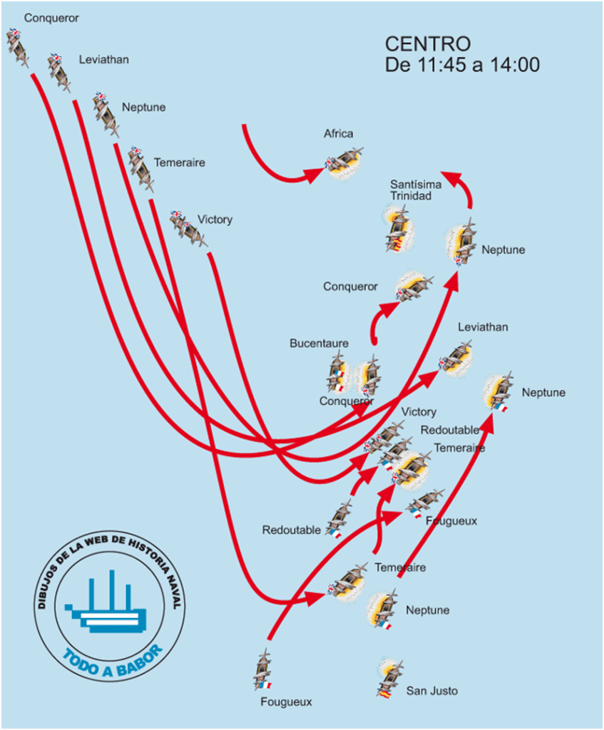Nelson, al ver la virada hacia Cádiz de la flota franco-española adaptó su plan inicial y se limitó a señalar a Collingwood:”Mi intención es cortar la vanguardia enemiga para impedir su entrada en Cádiz; corte usted la retaguardia hacia el buque que hace el número doce a partir de la cola”.
