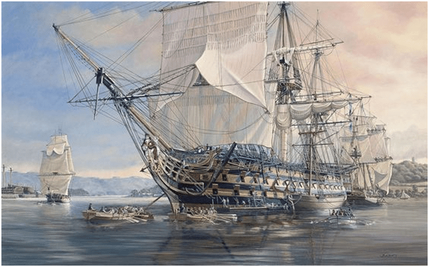 1- Los cuatro navíos que siguen órdenes de Dumanoir se alejan de la batalla tras intercambiar algún tiro con los británicos.