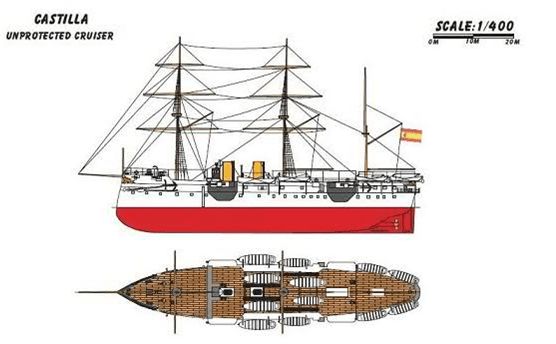 - El crucero de madera Castilla de 3.342 T, con 4 cañones de 152 mm y 2 de 120 mm (Armstrong). Sin capacidad de movimiento.