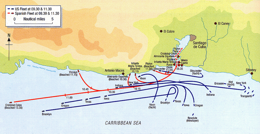 La escuadra española compuesta por un crucero acorazado (Cristóbal Colón) sin su armamento principal colocado, tres cruceros protegidos (Infanta María Teresa, Vizcaya y Almirante Oquendo) y dos modernos destructores contratorpederos (Plutón y Furor) se enfrentaban a cuatro acorazados modernos (USS Texas, similar al Maine, USS Iowa, USS Indiana y USS Oregón), dos nuevos cruceros acorazados (USS Brooklyn y USS New York; este último regresó justo a tiempo para participar en el final de la batalla), un cañonero (USS Ericsson) y tres cruceros auxiliares (USS Gloucestre, USS Resolute y USS Vixen).