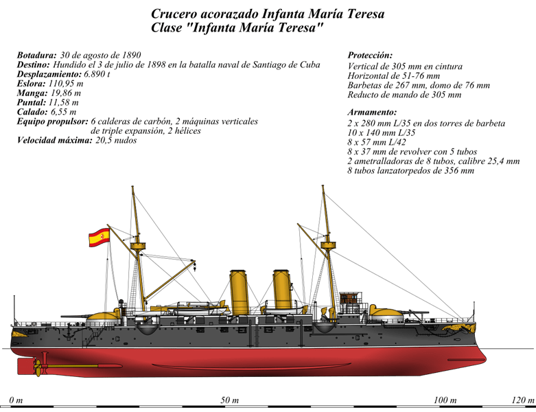 - Los cruceros acorazados Infanta María Teresa, Vizcaya y Almirante Oquendo de 6.890 T, con 2 cañones de 280 mm, 10 de 140 mm, 8 de 57 mm, y 8 de 37 mm, así como ocho tubos lanzatorpedos.
