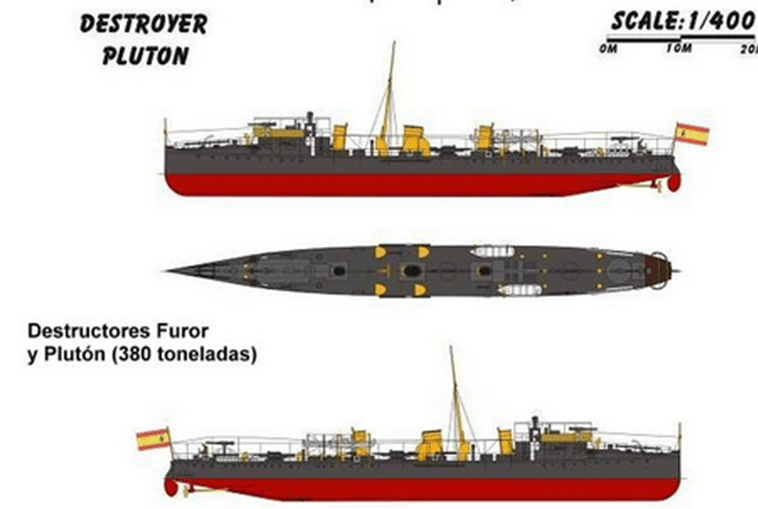 - Los Destructores Furor y Plutón de 380 T y 2 cañones Nordenfelt de 75 mm y 2 cañones Nordenfelt de 57 mm y 2 tubos lanzatorpedos.