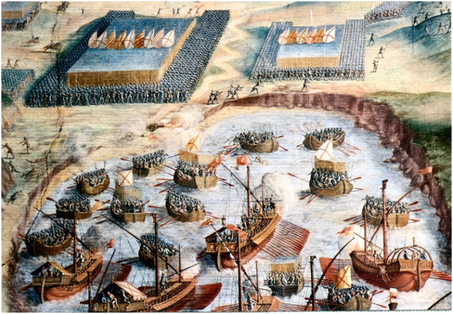 Una vez en tierra, los soldados de la fuerza de desembarco compuesta por los temibles Tercios, al mando del Maestre de Campo D. Lope de Figueroa, primer jefe del Tercio de Armada de Mar Océano (lo llamaban Tercio de Lope de Figueroa si combatían en el Mediterráneo).