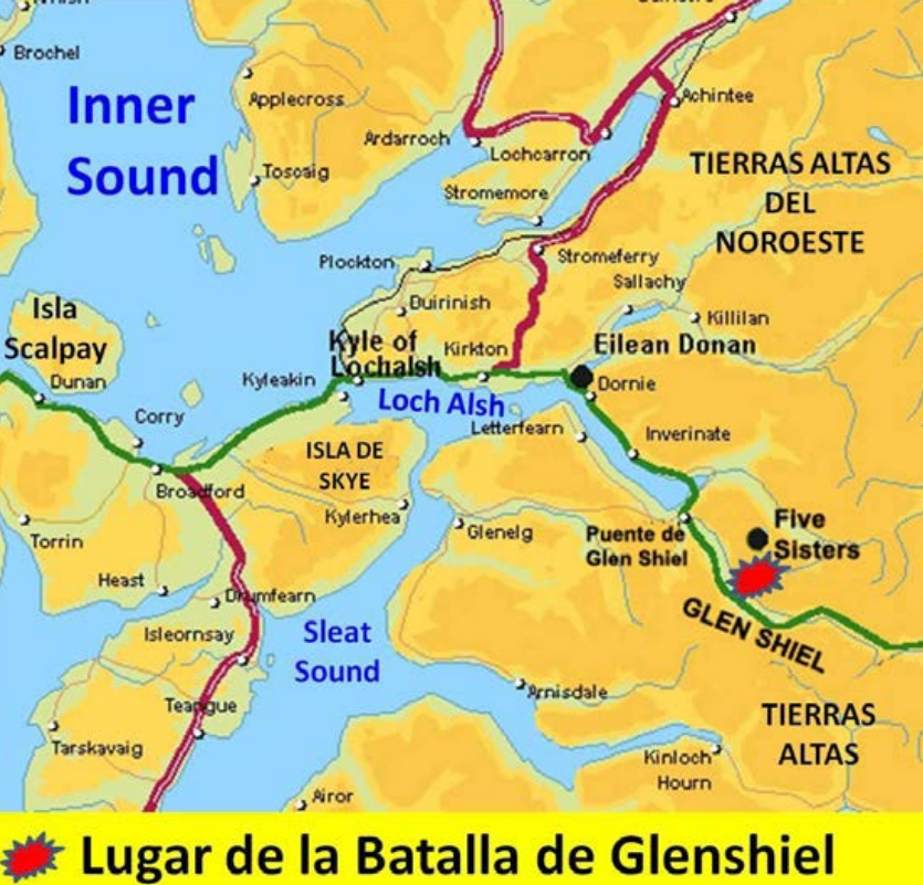 George Keith se vio obligado a desestimar el plan inicial de atacar Inverness y se dirigió hacia el castillo de Eilean Donan, estableciendo allí el cuartel general donde se guardaron la mayor parte de las armas y pertrechos. Las dos fragatas que habían transportado al contingente regresaron a España. Días más tarde se dirigen hacia el sur tratando una vez más de recabar mayores apoyos entre los escoceses dejando una pequeña guarnición en el Castillo, 50 españoles con un capitán y un teniente.