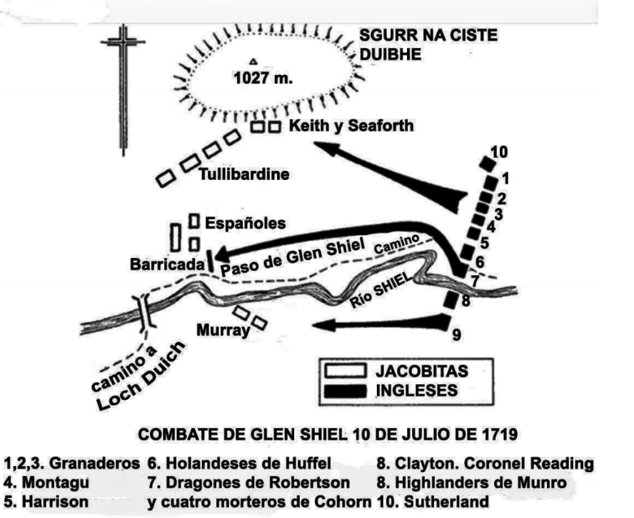 La fuerza entera de Wightman fue entonces dirigida hacia el centro Los españoles estaban bien anclados al terreno, pero vieron cómo la mayor parte de sus aliados los habían abandonado, que se retiraron hacia lo alto de la colina. Los españoles se retiraron por un paraje que aún es conocido como «Belachna-na-Spainnteach» o paso de los españoles, pero, sin escapatoria real, decidieron rendirse. La montaña en la cañada del río Shiel en la cual ocurrió la batalla se llama Sgurr Spainteach nan (Pico de los españoles), en honor de las fuerzas españolas que lucharon de forma admirable en la batalla.