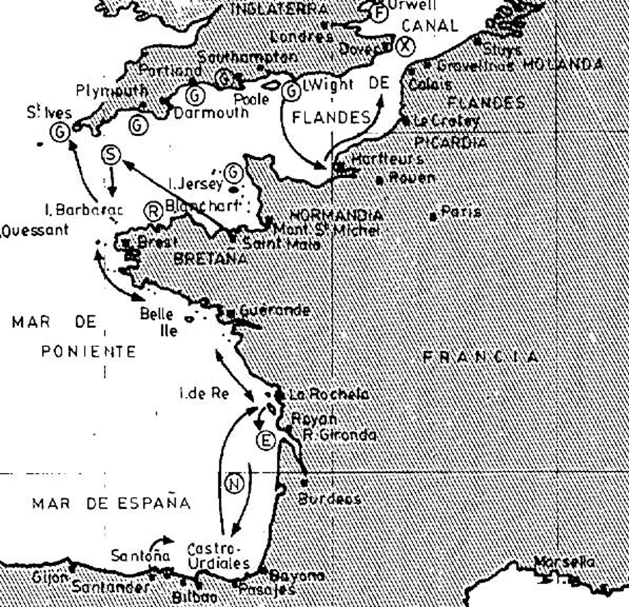 Partieron, por tanto, las cinco galeras de los aventureros camino de Inglaterra, recalando primero en la costa de Cornualles, donde desembarcaron, más tarde en Plymouth, de donde hubieron de huir ante la dura defensa de los ingleses, y después en Portland, que saquearon.