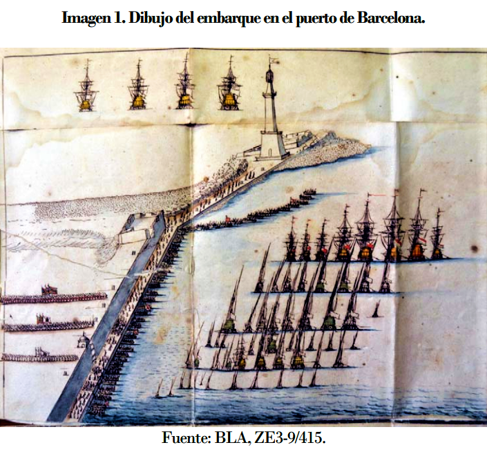 Embarque de la expedición en el puerto de Barcelona al mando del francés Lecheraine.