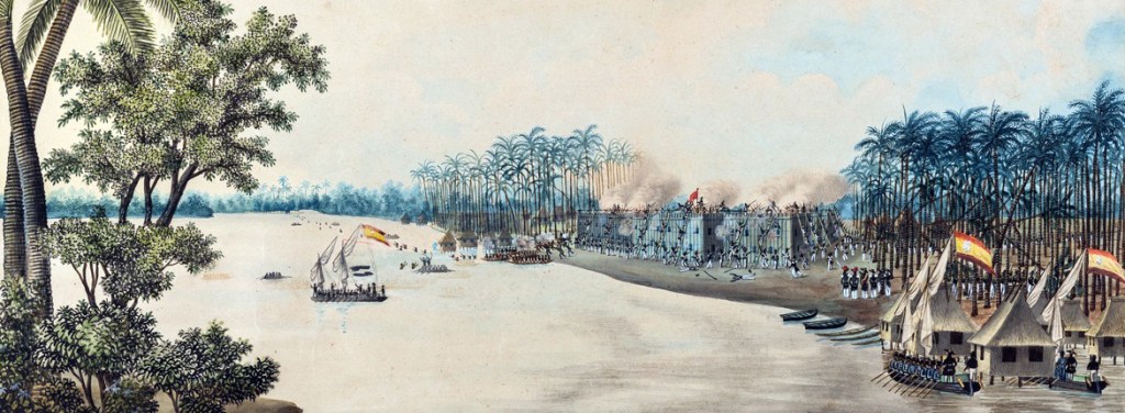 Se hizo necesario recurrir a garfios para trepar a los muros del fuerte, ya que sus paredes estaban construidas por troncos de árboles de 2 a 3 pies de diámetro y de 18 a 20 de altura, reforzados por empalizadas de contención de piedrapero a pesar de a pesar de este inconveniente y la obstinada resistencia de los moros, que se defendieron con rifles, granadas, lanzas y piedras, los españoles consiguieron llegar a sus posiciones y hacerse con ellas. Unos 25 piratas murieron durante el combate en el interior del fuerte, mientras que otros 30 o 40 se zambulleron en el agua y se ahogaron o murieron a causa de los disparos desde las falucas y los botes armados hispanos. Las pérdidas de las autoridades coloniales ascendieron a 5 soldados regulares y 2 auxiliares muertos, y a unos 50 heridos, entre ellos los coroneles José María Peñaranda y Cayetano Figueroa.